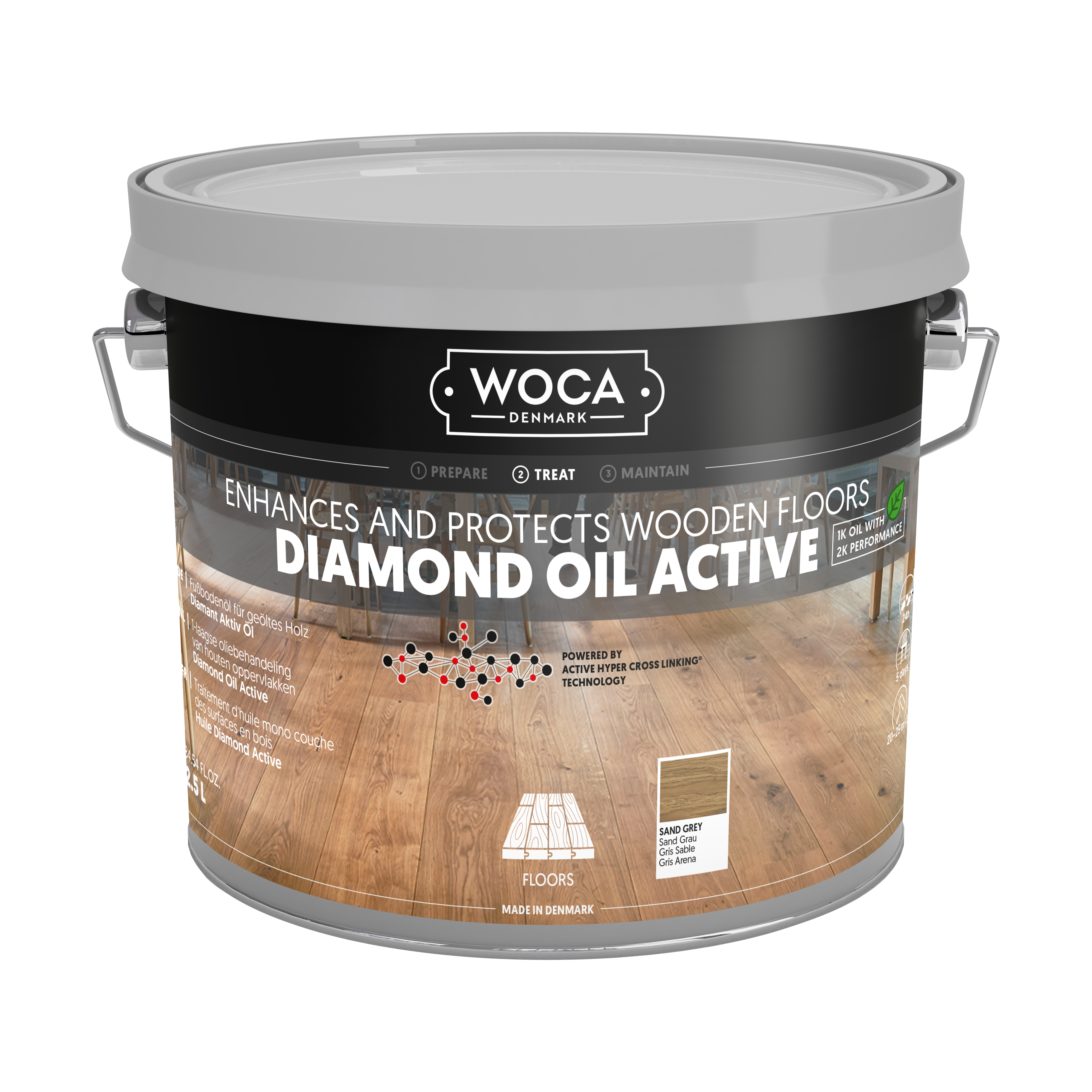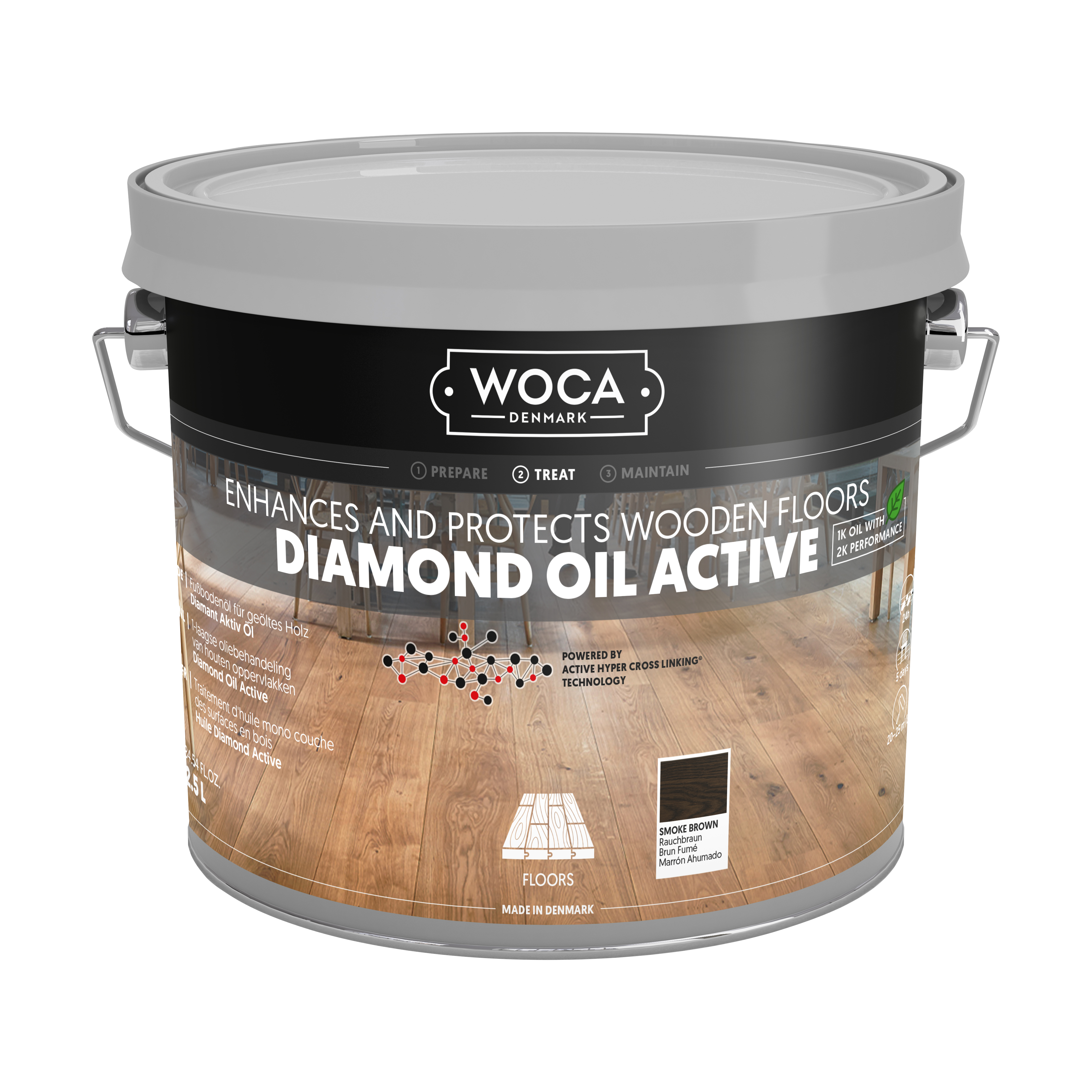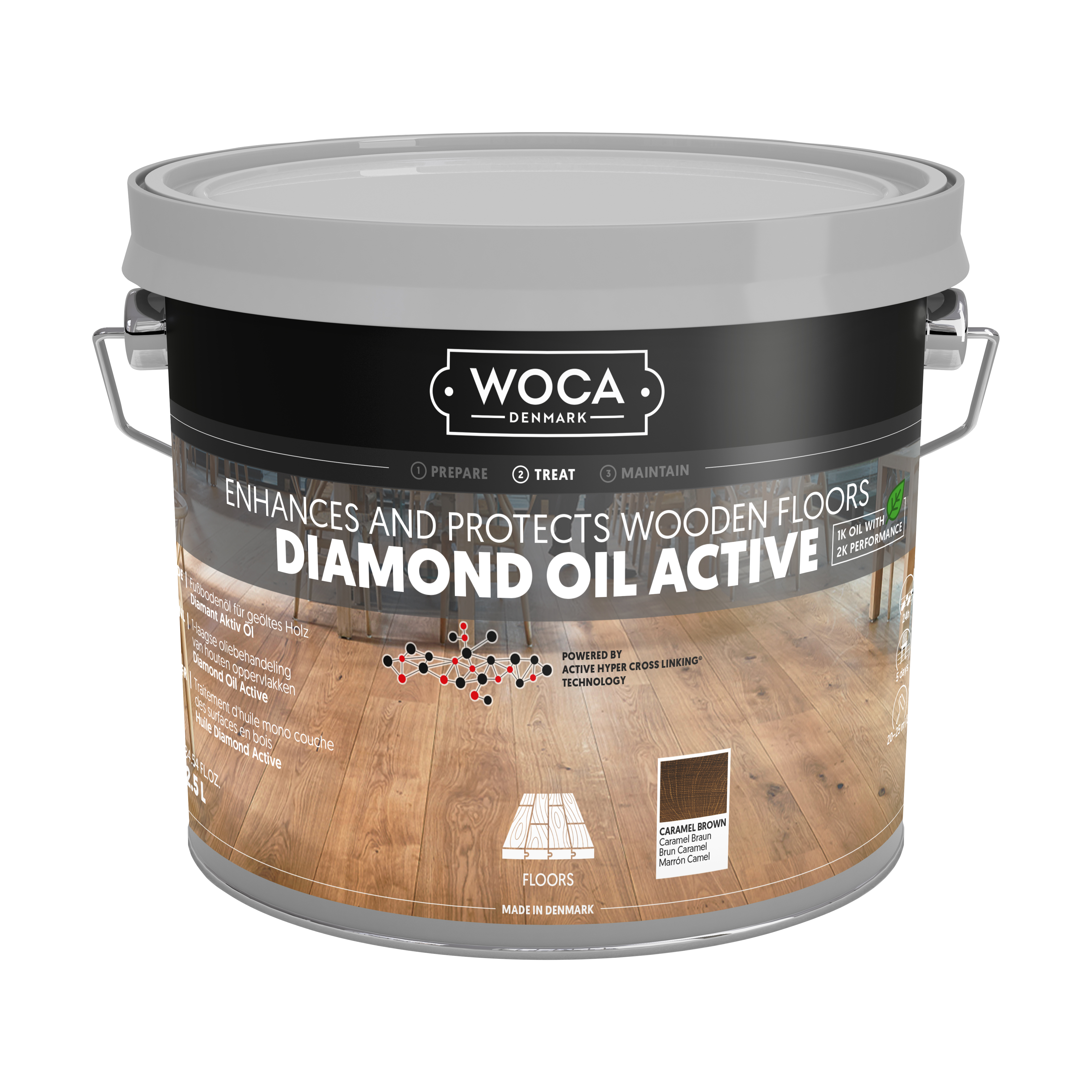 Diamond Oil Active er en bæredygtig, VOC-fri olie til trægulve, bordplader og møbler. Denne eksklusive, enkeltkomponents olie med lav lugt er slidstærk, nem at påføre og minimerer spild. Med sin hyper-crosslink-teknologi skabes en vandafvisende, skridsikker overflade, der er let at rengøre og vedligeholde. Med et tørstofindhold på ca. 99 % er olien ideel til maskinapplikation på ubehandlet eller slebet træ af enhver type.
