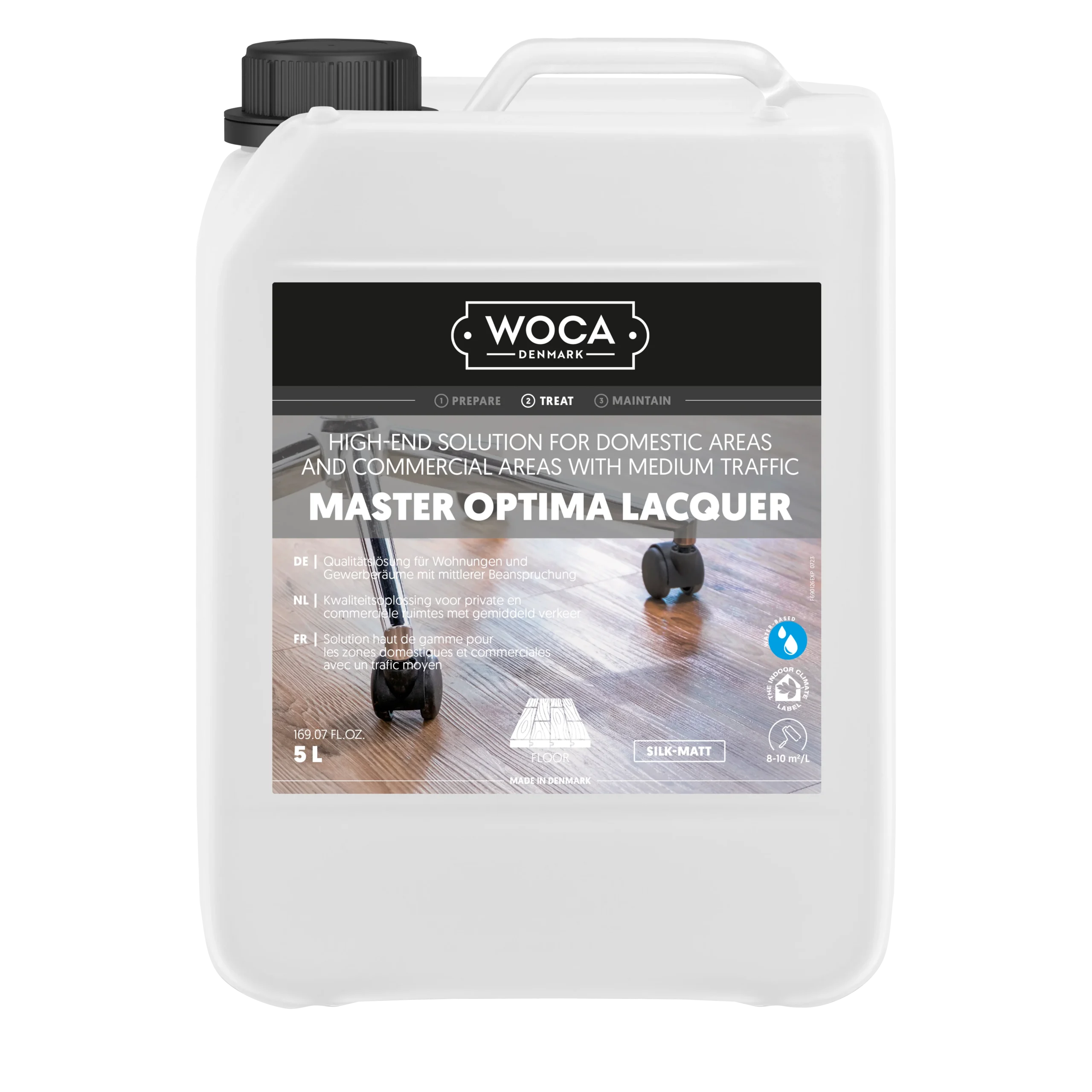 Master Optima Lacquer er en hurtigtørrende, vandbaseret gulvlak udviklet til at give træet en holdbar og resistent overflade. Det høje tørstofindhold opfugter træet en smule og tilfører overfladen et kraftigt og fyldigt look. Lakken er nem at påføre og har en god resistens over for vand og kemikalier, hvilket gør den egnet til kontorer og andre kommercielle områder udsat for medium trafik. Den indeklimamærkede lak påføres på en nem og sikker måde, og sikrer et behageligt indeklima efterfølgende.