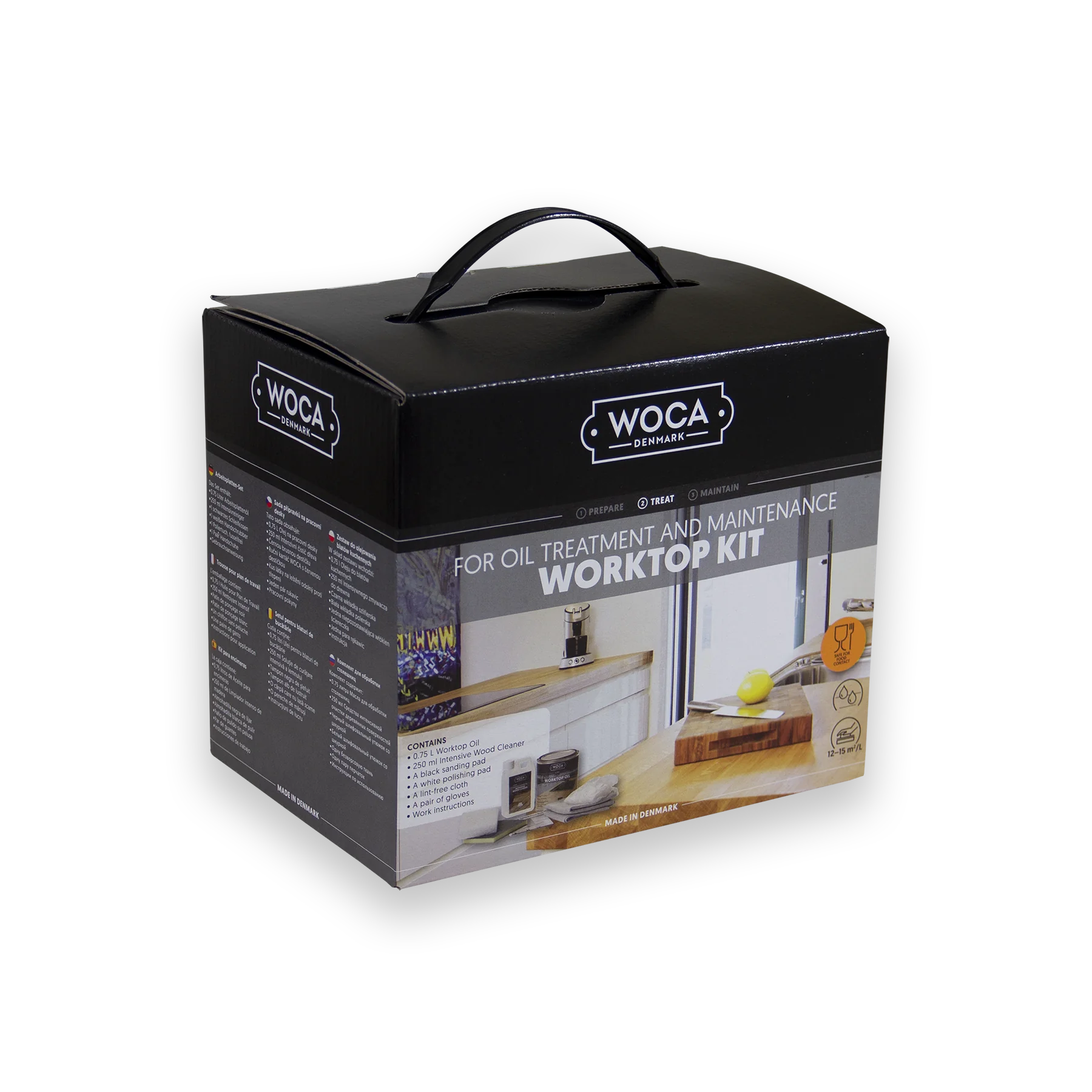 WOCA Worktop Kit wird zur Ölbehandlung und Pflege von Arbeitsplatten und anderen Holzoberflächen im Innenbereich verwendet. Das Öl lässt sich leicht verarbeiten und schafft eine strapazierfähige Oberfläche mit hoher Widerstandsfähigkeit. Arbeitsplattenöl ist ein lufthärtendes Öl, das tief in das Holz eindringt und eine strapazierfähige, wasser- und schmutzabweisende Oberfläche hinterlässt. Das Öl hebt den natürlichen Glanz des Holzes hervor und verleiht der Oberfläche ein natürliches, frisches Aussehen. Arbeitsplattenöl ist unbedenklich für den Kontakt mit Lebensmitteln und kann auf unbehandelten oder zuvor geölten und geschliffenen Oberflächen verwendet werden. Das Kit enthält alles, was Sie für die gesamte Behandlung benötigen: 0,75 l Worktop Oil, 250 ml Intensive Wood Cleaner, schwarzes Schleifpad, weißes Polierpad, ein fusselfreies Tuch, ein Paar Handschuhe und eine Arbeitsanweisung.