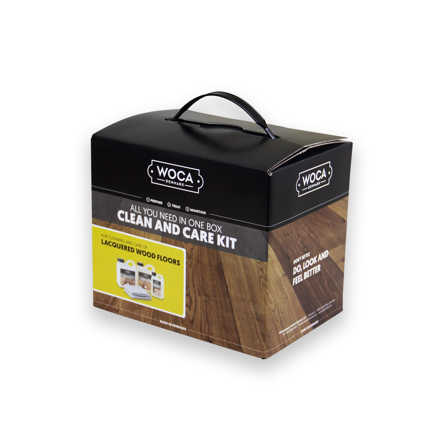 WOCA Clean and Care Kit for lacquered wood contains all you need in a box for cleaning and caring of your lacquered floors so that they stay beautifull and strong longer. The Kit contains 1 L Master Cleaner, 250 ml Intensive Wood Cleaner, 1 L Master Care, cloth and work instructions. Master Cleaner removes dirt and grime effectively, strengthens the surface and makes it more resistant to spills. Master Care smoothens small scratches, increases the resistance of the surface and provides effective protection against wear.