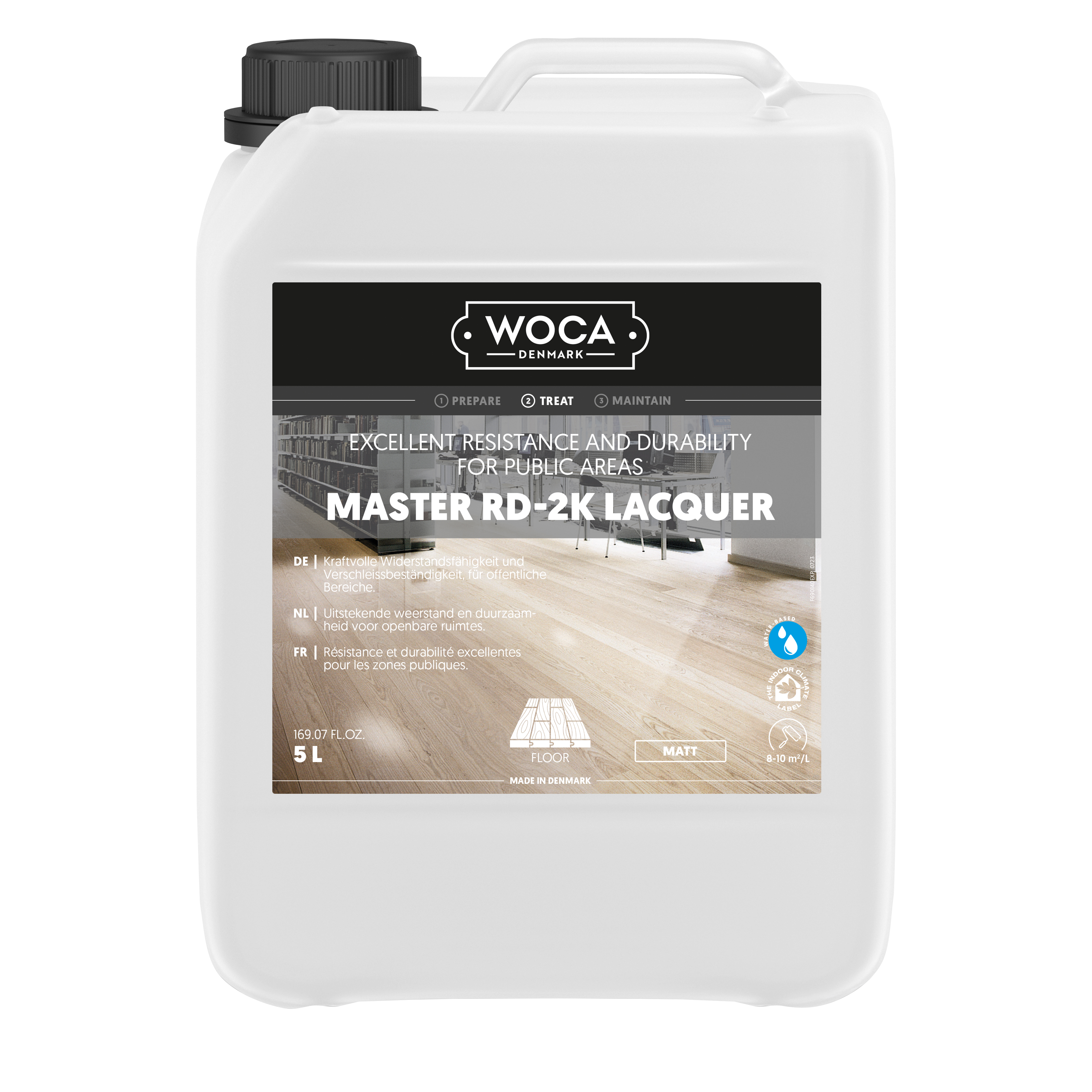 Master RD-2K Lacquer is a water-based, two-component lacquer with an isocyanate-free hardener, ideal for heavy-traffic areas like canteens and stairs. It provides strong protection, high slip resistance, and resists black heel marks, scratches, and stains. Clear and light-preserving, it is easy to apply and ensures a comfortable indoor environment.