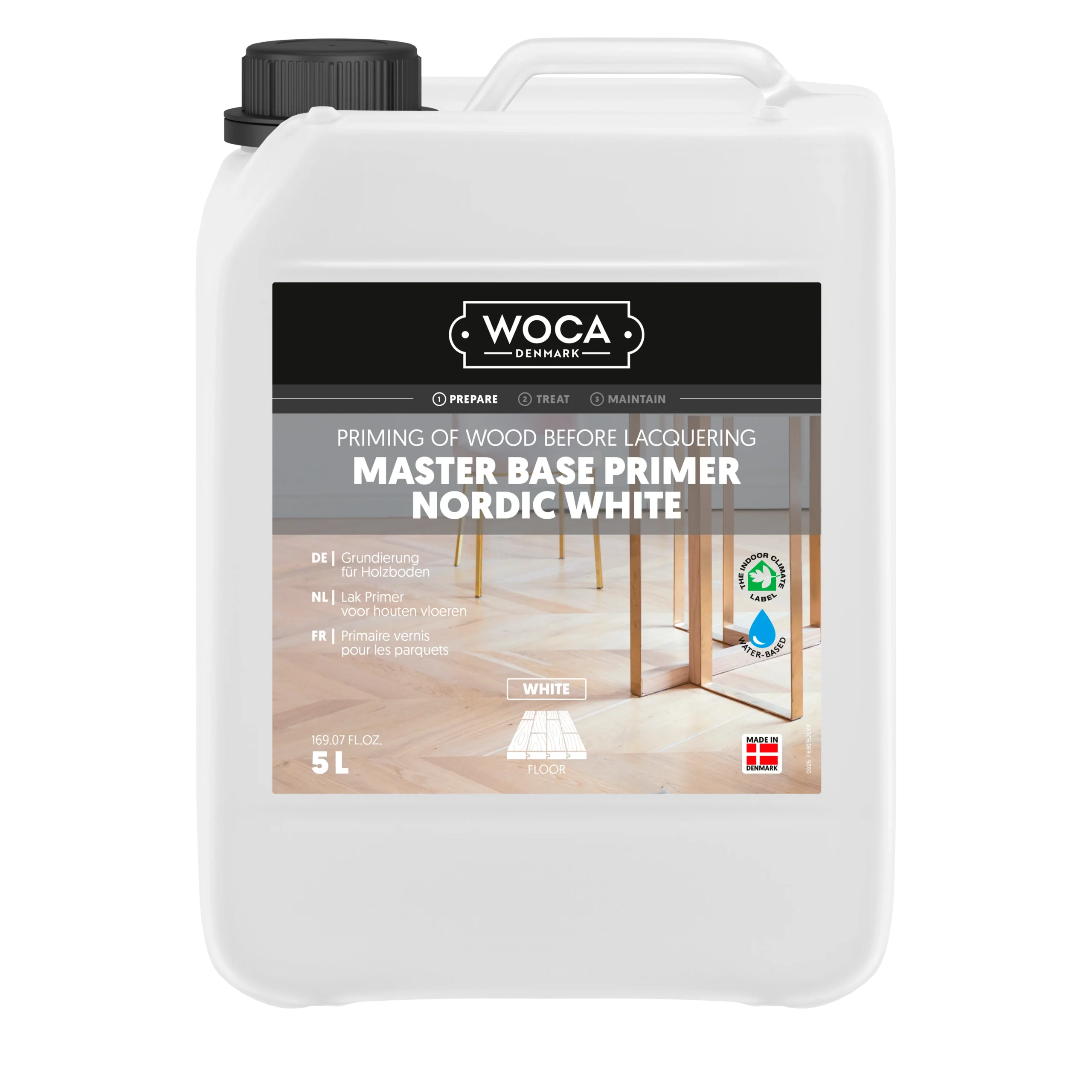 Master Base Primer, Nordic White is a water-based wood primer that is ideal for areas where a light nordic look is required. The primer seals the wood and minimizes the tannic acid penetration and side-bonding. It is only suitable for untreated or sanded surfaces for all wood types before treatment with other water-based WOCA floor lacquers.