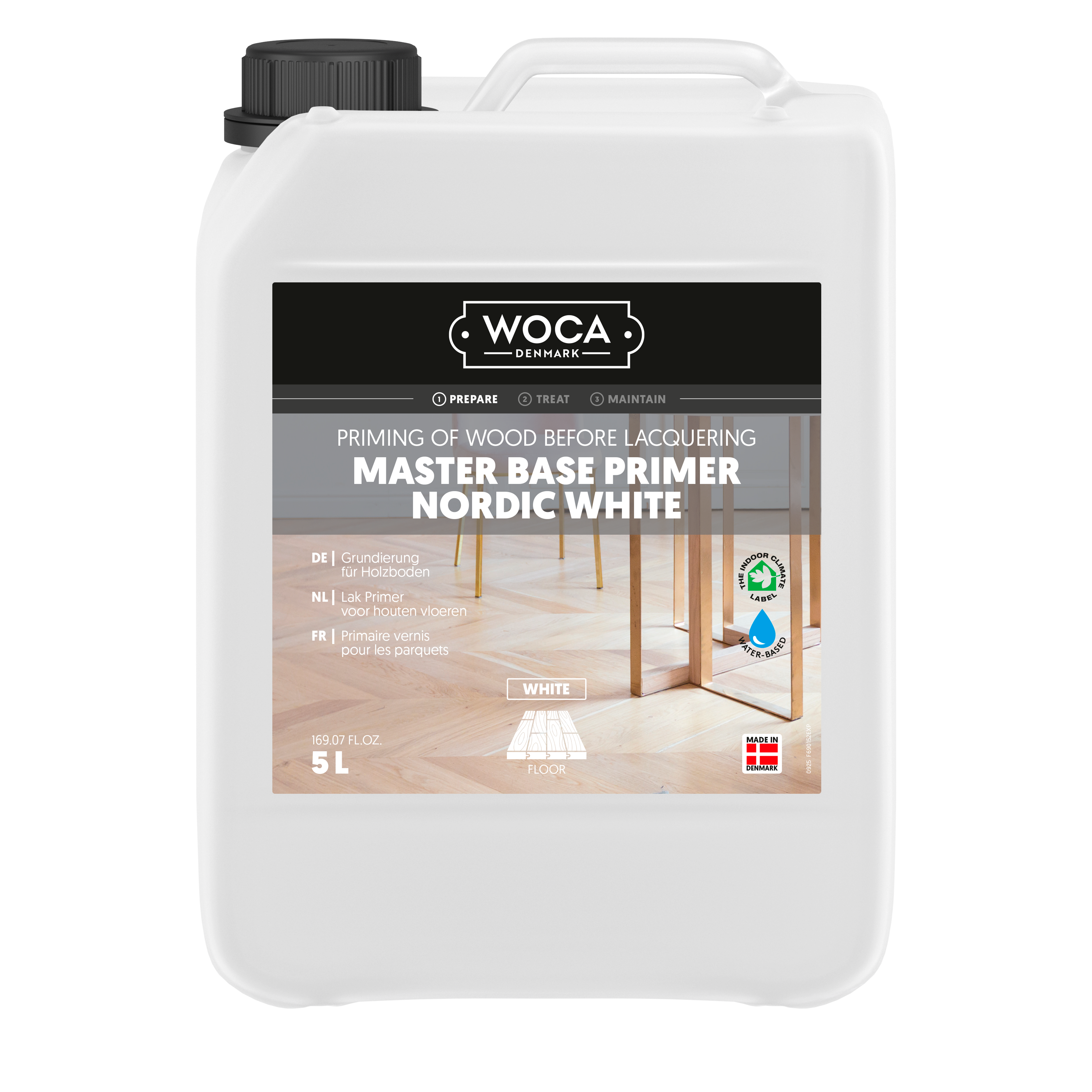 Master Base Primer, Nordic White is een houtprimer op waterbasis die ideaal is voor gebieden waar een lichte nordic look vereist is. De primer verzegelt het hout en minimaliseert de penetratie van looizuur en zijverlijming. Het is alleen geschikt voor onbehandelde of geschuurde oppervlakken voor alle houtsoorten voordat het wordt behandeld met andere WOCA-vloerlakken op waterbasis.