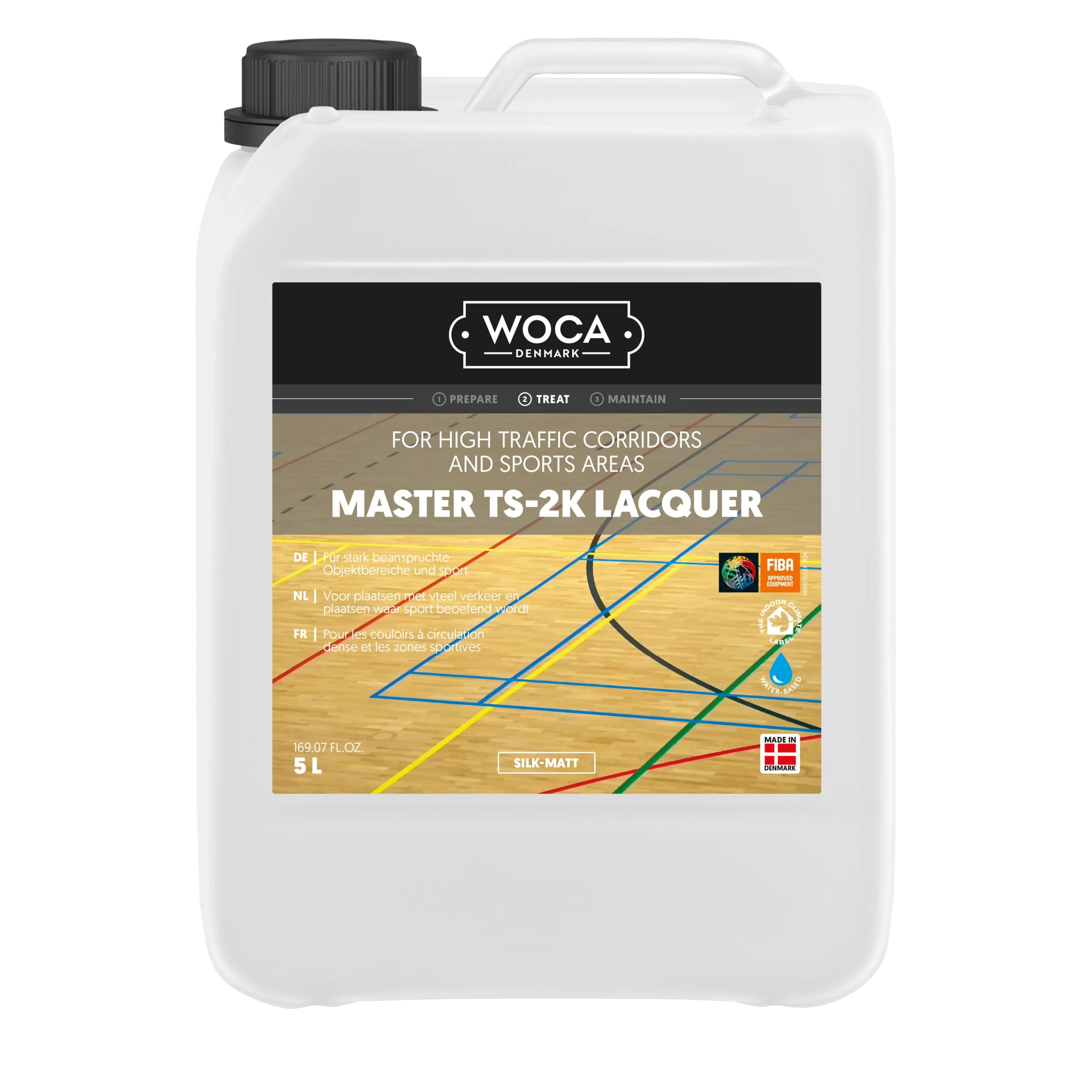 Master TS-2K Lacquer to dwukomponentowy wodny lakier przeznaczony w szczególności do drewnianych podłóg w korytarzach, obiektach sportowych, halach wielofunkcyjnych i podobnych przestrzeniach o dużym natężeniu ruchu. Charakteryzuje go nadzwyczajna wytrzymałość i ochrona drewna, wysoki stopień trwałości oraz wyjątkowa odporność na zarysowania, zaplamienia i czarne ślady po obuwiu. Lakier posiada duńskie oznaczenie DICL (Danish Indoor Climate Label), co oznacza, że zapewnia przyjazne i bezpieczne środowisko pracy podczas aplikacji oraz zdrowy klimat we wnętrzach w trakcie użytkowania.